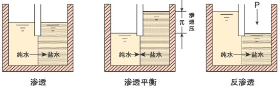 如圖所示:低濃度側(cè)水會(huì)透過半透膜向高濃度側(cè)擴(kuò)散,直至達(dá)到動(dòng)態(tài)平衡。此時(shí)半透膜兩側(cè)的液位差形成為滲透壓。當(dāng)在高濃度側(cè)加一外部壓力,隨壓力增加,水分子逐漸滲透到低濃度一側(cè)。當(dāng)所施加壓力大于滲透壓時(shí),低濃度側(cè)液位將高于高濃度側(cè)液位,這種現(xiàn)象稱為反滲透。