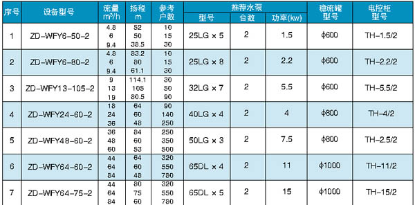 八、無負壓供水設備選型參考表