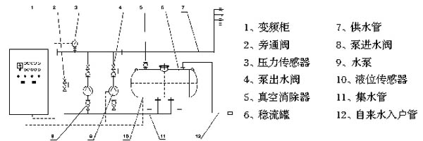 無負壓供水設備通過微機設定用戶所需的供水壓力,當用戶的用水量增加,微機檢測到自來水的壓力低于用戶所需的用水壓力時,微機會自動控制變頻器啟動,管網(wǎng)壓力調(diào)節(jié)系統(tǒng)工作,直到使管網(wǎng)壓力增加到用戶所需的用水壓力時,微機控制變頻器輸出一恒定的頻率,管網(wǎng)壓力調(diào)節(jié)系統(tǒng)以一恒定的壓力運行,使用戶用水壓力恒定。
