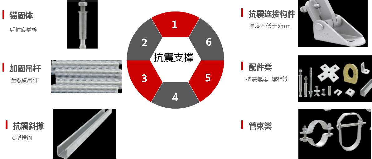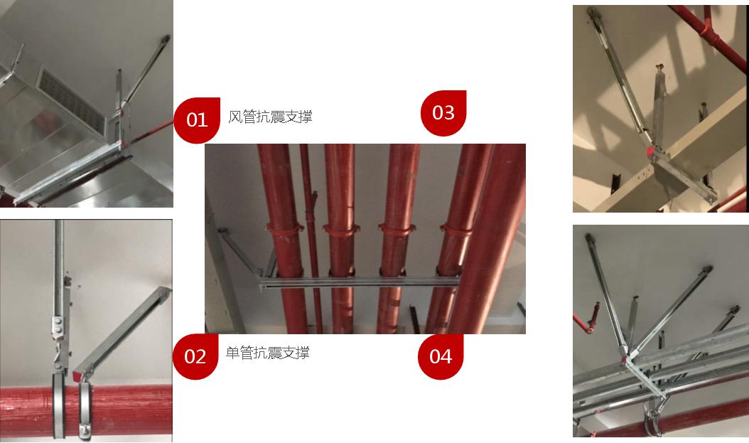 抗震支撐系統(tǒng):與建筑結(jié)構(gòu)體可靠連接(混凝土錨栓連接/鋼結(jié)構(gòu)焊接或螺栓連接),由錨固體、加固吊桿、斜撐以及抗震連接構(gòu)件組成。